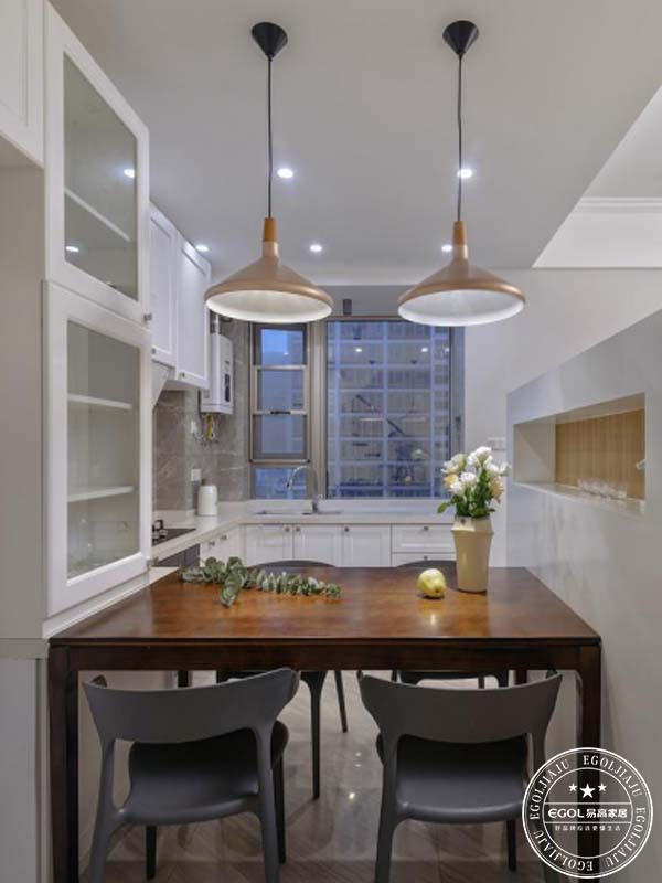 樓梯下方空間設計了一整排儲物柜子,增加收納;櫥柜也一起連過來做了通透玻璃高柜,方便后期防止被子紅酒之類物品。餐廳面隔斷中間又做了局部掏空,方便放置小物品也增大視覺效果,告別壓抑。隔斷,屏風他的寓意是有靠山,聚財納福。