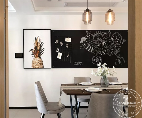 業(yè)主比較喜歡簡單、不復(fù)雜浮夸的東西;因此易高家居設(shè)計建議文藝范設(shè)計處理大白墻,定做一塊黑板,旁邊掛畫使用女主的畫作“金色菠蘿”與整體木色調(diào)完美融合。當然,畫作是可以跟隨業(yè)主需求自由更換;“黑板報”也可以根據(jù)不同節(jié)目而自由修改。此處,家居設(shè)計師將全屋定制個性定制體現(xiàn)的淋漓盡致。