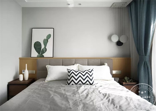 夏天陽光照射,避免感覺太熱,業(yè)主聽隨設(shè)計師意見采用藍色的窗簾降溫,其他小飾品推薦選購柜貓家居軟裝飾品,或者淘寶一些物美價廉的單品。因臥室業(yè)主不準備放電視,所以設(shè)計做了一套梳妝臺和矮柜,增加儲物空間。
