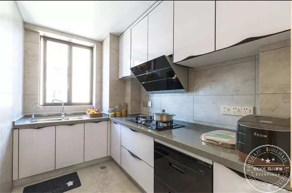 L型廚房,設(shè)計采用白色整體櫥柜,操作臺較大,可同時容納兩三人同時作業(yè)。廚房開窗,采光好、通風性強;在這樣干凈、明亮的廚房作業(yè),心情美美噠。