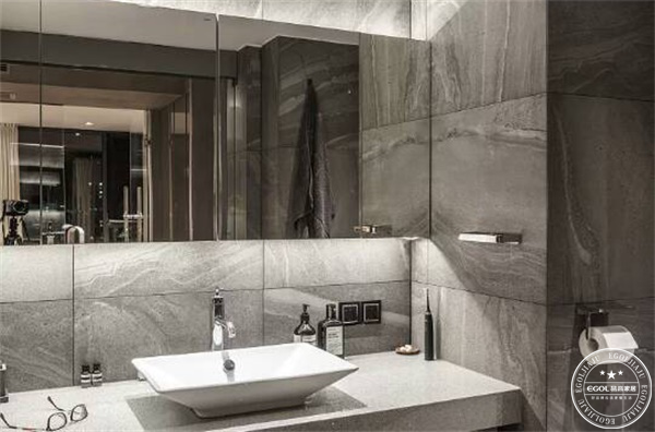 走光衛生間,裝修改造格調冷峻,鏡柜內增設插座,給牙刷等充電設備用。