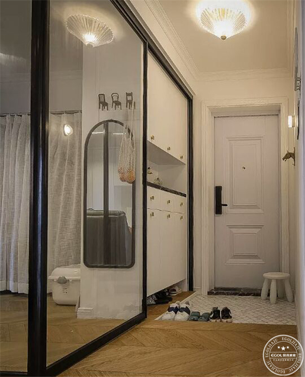 下沉式玄關,進門第一眼就是一整面的柜子和雙開門,門上的小松鼠可以提起來但基本就是純裝飾;魚骨拼和大理石馬賽克共筑的溫柔,用踢腳線上半部分完成的拼接。