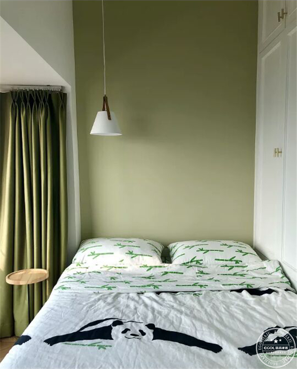 主臥的色彩敲定順序是-墻紙-衣柜-窗簾。客廳級別的燈放置在臥室里,和壁燈形成一套,把橘色絲絨窗簾照的發金光。