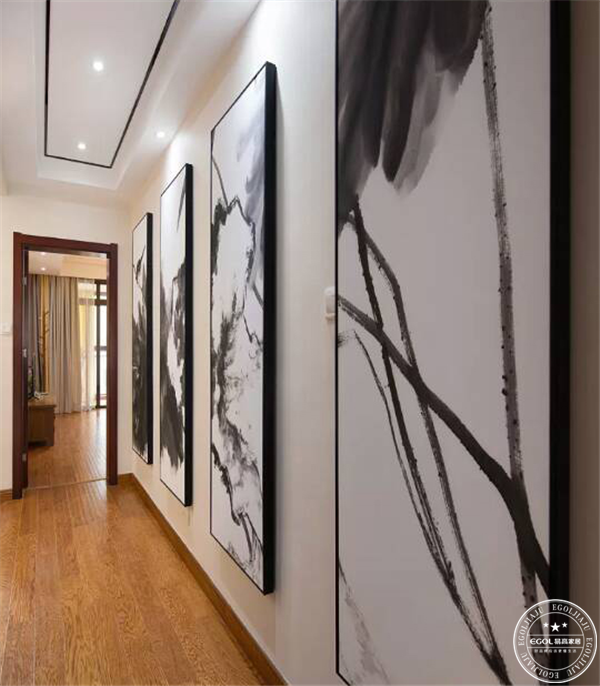 過道的墻面僅僅做了簡單的肌理墻紙的鋪貼,但四聯幅的水墨畫,既豐富的空間,也提升了整體的品味。