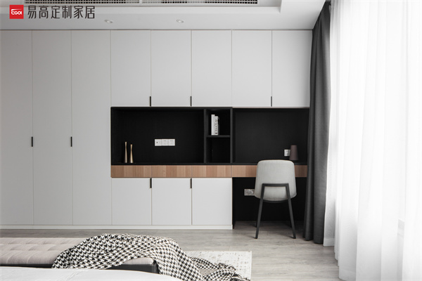 一字型的衣帽架是將整面墻都打造成衣柜,整個設計是呈一字排開的,非常適合小戶型臥室。臥室空間比較小可以打造一個滿墻的儲物空間,如果條件允許還可以嵌入墻里,節省空間。