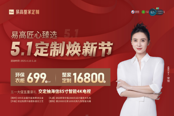 五一家裝季,易高定制煥新超前享。2025年4月18日——5月18日,易高整家定制“5.1定制煥新節”“放價”活動上線,解鎖環保衣柜699元/㎡超低定制價。匠心臻選,大牌定制福利購。