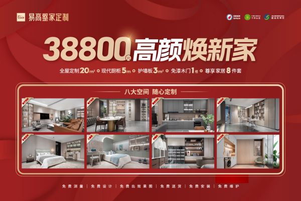 38800元煥新套餐包括了全屋20㎡柜類定制+5m現在櫥柜+3㎡護墻板+木門+軟裝8件套。升級激光封邊工藝,品質高,更耐用。全屋8大空間家具定制,數百種花色任選,優選易高環保易居板,更健康、更環保的基材選用,只為給消費者定制更安心的家。