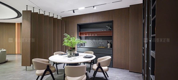 通透的屏風和開放格設計相輔相成,呼吸感穿梭其中,生動演繹意式美學的優雅與從容。線性燈帶沿著柜體輪廓隨性流淌,明暗交匯間,無限放大光影美感。