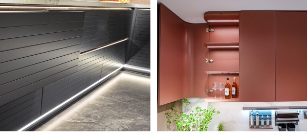 高效U型布局,沉穩的深灰與活潑的荔枝紅在空間層疊交織,上演克制與熱烈的平衡。從操作臺延伸出吧臺,廚房不再是一個人的孤島,而是一家人的美食共享空間。